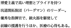 博愛主義で高い理想とプライドを持つ 坑道開拓旅団(バーグマン)のリーダー。 優秀な指揮官で、銃火器を駆使して 前線の援護を行うほか、医療の心得もある。