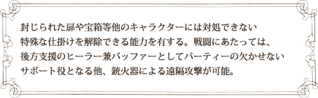 封じられた扉や宝箱等他のキャラクターには対処できない 特殊な仕掛けを解除できる能力を有する。戦闘にあたっては、 後方支援のヒーラー兼バッファーとしてパーティーの欠かせない サポート役となる他、銃火器による遠隔攻撃が可能。