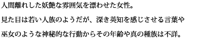 人間離れした妖艶な雰囲気を漂わせた女性。 見た目は若い人族のようだが、深き英知を感じさせる言葉や巫女のような 神秘的な行動からその年齢や真の種族は不詳。