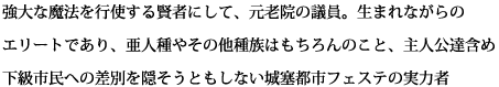強大な魔法を行使する賢者にして、元老院の議員。生まれながらの エリートであり、亜人種やその他種族はもちろんのこと、主人公達含め 下級市民への差別を隠そうともしない城塞都市フェステの実力者