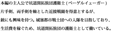 本編の主人公で坑道開拓旅団護衛士(ベーゲルイェーガー ) 片手剣、両手剣を軸とした近接戦闘を得意とするが、銃にも興味を持つ。 城塞都市戦士団への入隊を目指しており、生活費を稼ぐため、 坑道開拓旅団の護衛士として働いている。