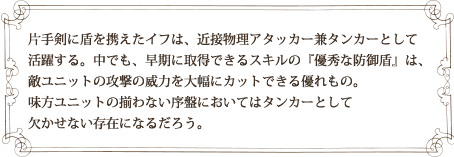 片手剣に盾を携えたイフは、近接物理アタッカー兼タンカーとして 活躍する。中でも、早期に取得できるスキルの『優秀な防御盾』は、 敵ユニットの攻撃の威力を大幅にカットできる優れもの。 味方ユニットの揃わない序盤においてはタンカーとして 欠かせない存在になるだろう。
