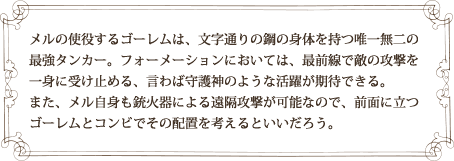 メルの使役するゴーレムは、文字通りの鋼の身体を持つ唯一無二の 最強タンカー。フォーメーションにおいては、最前線で敵の攻撃を 一身に受け止める、言わば守護神のような活躍が期待できる。 また、メル自身も銃火器による遠隔攻撃が可能なので、前面に立つ ゴーレムとコンビでその配置を考えるといいだろう。