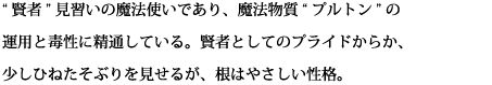“賢者”見習いの魔法使いであり、魔法物質“プルトン”の運用と毒性に精通している。 賢者としてのプライドからか、少しひねたそぶりを見せるが、 根はやさしい性格。