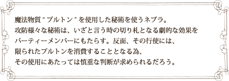 魔法物質“プルトン”を使用した秘術を使うネブラ。 攻防様々な秘術は、いざと言う時の切り札となる劇的な効果を パーティーメンバーにもたらす。反面、その行使には、 限られたプルトンを消費することとなる為、 その使用にあたっては慎重な判断が求められるだろう。