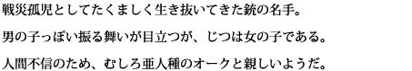 戦災孤児としてたくましく生き抜いてきた銃の名手。 男の子っぽい振る舞いが目立つが、じつは女の子である。 人間不信のため、むしろ亜人種のオークと親しいようだ。
