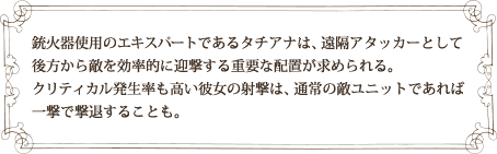 銃火器使用のエキスパートであるタチアナは、遠隔アタッカーとして 後方から敵を効率的に迎撃する重要な配置が求められる。 クリティカル発生率も高い彼女の射撃は、通常の敵ユニットであれば一撃で撃退することも。