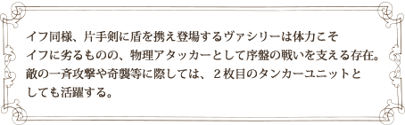 イフ同様、片手剣に盾を携え登場するヴァシリーは体力こそ イフに劣るものの、物理アタッカーとして序盤の戦いを支える存在。 敵の一斉攻撃や奇襲等に際しては、2枚目のタンカーユニットと しても活躍する。