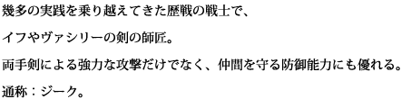幾多の実践を乗り越えてきた歴戦の戦士で、 イフやヴァシリーの剣の師匠。 両手剣による強力な攻撃だけでなく、仲間を守る防御能力にも優れる。 通称:ジーク。