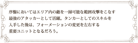 序盤においてはエリア内の敵を一掃可能な範囲攻撃をこなす 最強のアタッカーとして活躍。タンカーとしてのスキルを 入手した後は、フォーメーションの変更を左右する重要ユニットとなるだろう。